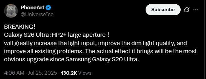 Obecnie Galaxy S25 Ultra korzysta z obiektywu o przysłonie f/1.7. Jeśli przeciek się potwierdzi, Galaxy S26 Ultra może otrzymać obiektyw z przysłoną f/1.6 lub niższą, co byłoby istotnym skokiem jakościowym. Przynajmniej na papierze. UniverseIce twierdzi, że takie połączenie pozwoli „rozwiązać wszystkie dotychczasowe problemy” aparatu i poprawi jakość zdjęć nocnych.