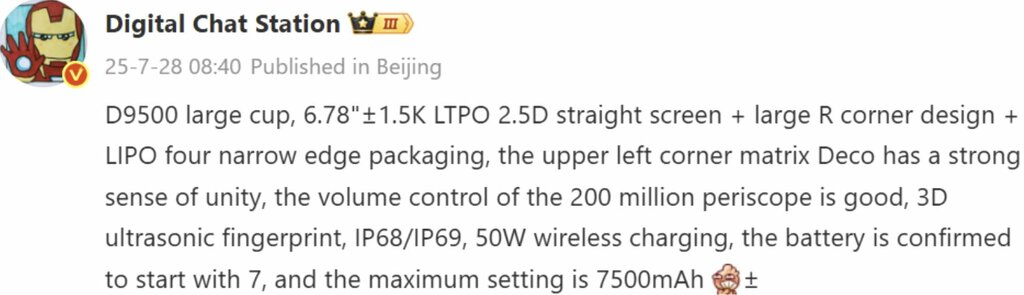 Do tego Digital Chat Station wspomina o obecności 6.78-calowego ekranu 1.5K, wykonanego w technologii LTPO. Oznacza to, że częstotliwość odświeżania będzie regulowana w zakresie od 1 do 120 Hz. Dzięki temu najwięcej zyskuje czas pracy, bo statyczne treści pokazywane są przy 1 Hz. Z kolei technologia LIPO pozwoli na uzyskanie rekordowo cienkich ramek.