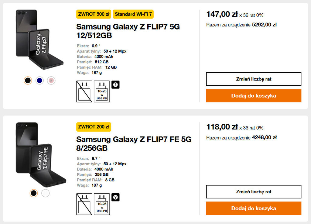 I rzeczywiście: cena wyjściowa Galaxy Z Flip 7 512 GB na orange.pl wynosi 5292 zł, a Galaxy Z Flip 7 FE 256 GB – 4248 złotych. Telefony te są tańsze w Orange o około 200 zł i możesz je zamówić na 36 rat 0%.