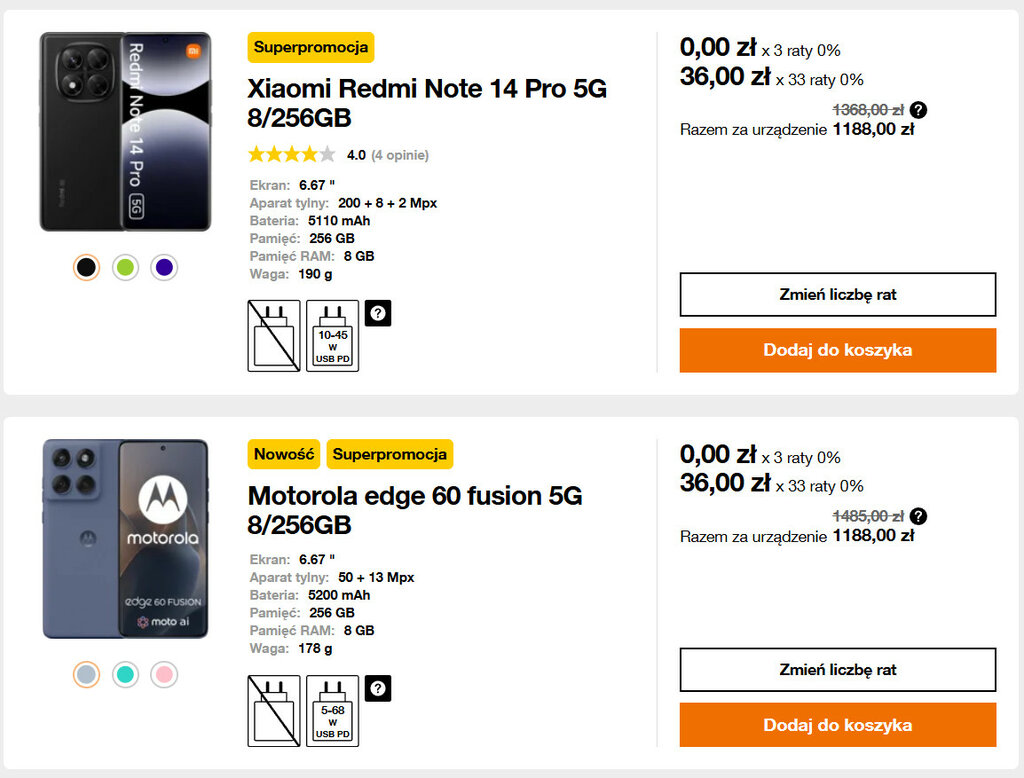 Niektóre z nich wychodzą taniej niż w sklepach, ale trzeba pamiętać o osobnym abonamencie Orange. Jeżeli go nie potrzebujesz, a podobają Ci się powyższe smartfony, to możesz też je kupić bez umowy za odpowiednio około 1289, 2299 oraz 1299 złotych. Tyle zazwyczaj kosztują Xiaomi Redmi Note 14 Pro w wariancie 8/256 GB, Samsung Galaxy S24 FE 8/128 GB oraz Motorola Edge 60 Fusion 8/256 GB.