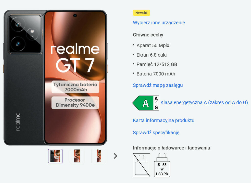 Obie wersje mają baterię 7000 mAh, ale takie samo ogniwo 120 W ma też ich bardzo bliski kuzyn. Mowa o tańszym modelu realme GT 7T. Za wariant 12/512 GB wydasz w Play lub w różnych sklepach najczęściej 2999 złotych.