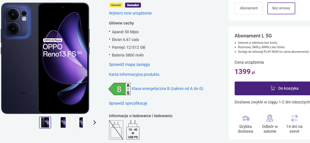A jeśli nie potrzebujesz nowego abonamentu komórkowego, to zamów OPPO Reno13 FS w Play bez umowy, ale wówczas jego cena wyniesie 1399 złotych. Mowa o tym samym modelu 12/512 GB, po prostu fioletowy operator daje z automatu niewielkie upusty na telefony w swoich abonamentach.