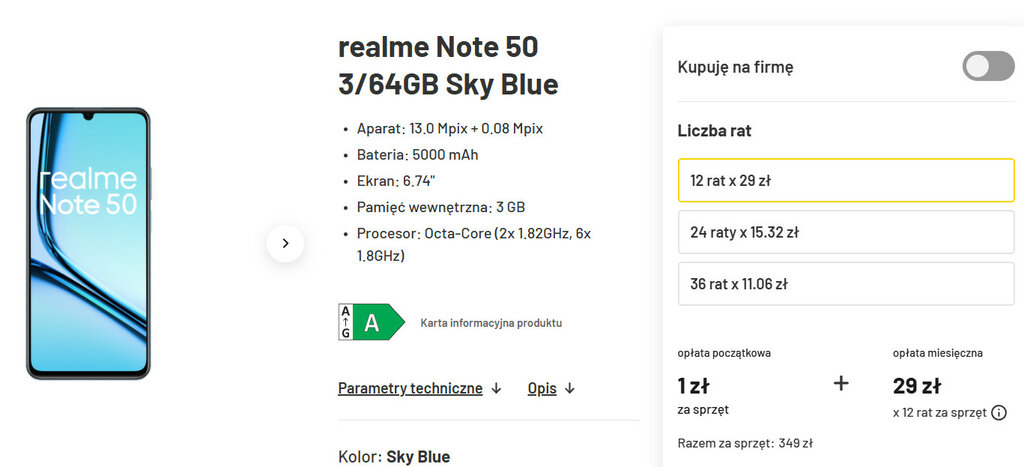 Zdecydowanie realme Note 50 z dość skromną pamięcią 3/64 GB. Jego opłata startowa wynosi 1 złotówkę, a ratalna – tylko 29 złotych. Tak – jeżeli wybierzesz opcję spłaty telefonu na 12 rat, to każda rata za Note’a 60 wyniesie właśnie 29 zł na miesiąc. W sumie na smartfona wydasz tylko 349 złotych, a nie będziesz go spłacał przez 2 czy 3 lata, lecz tylko w rok!