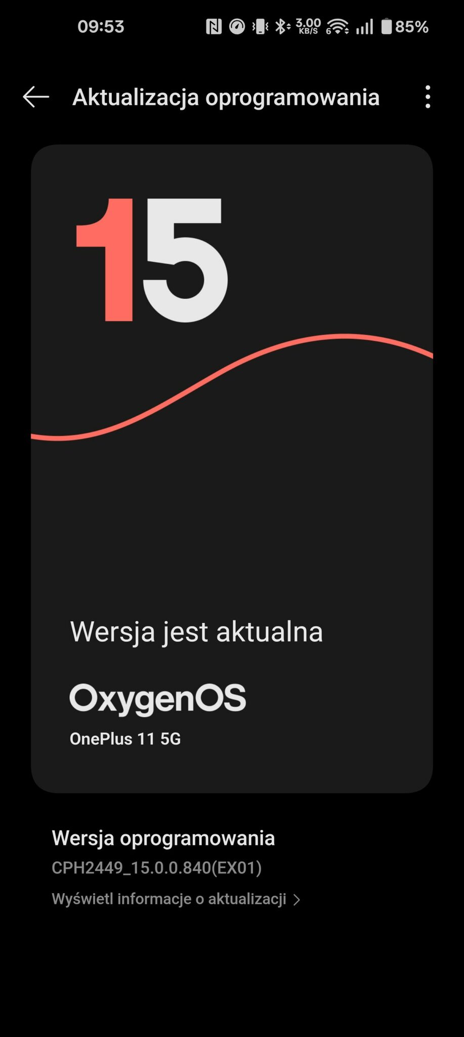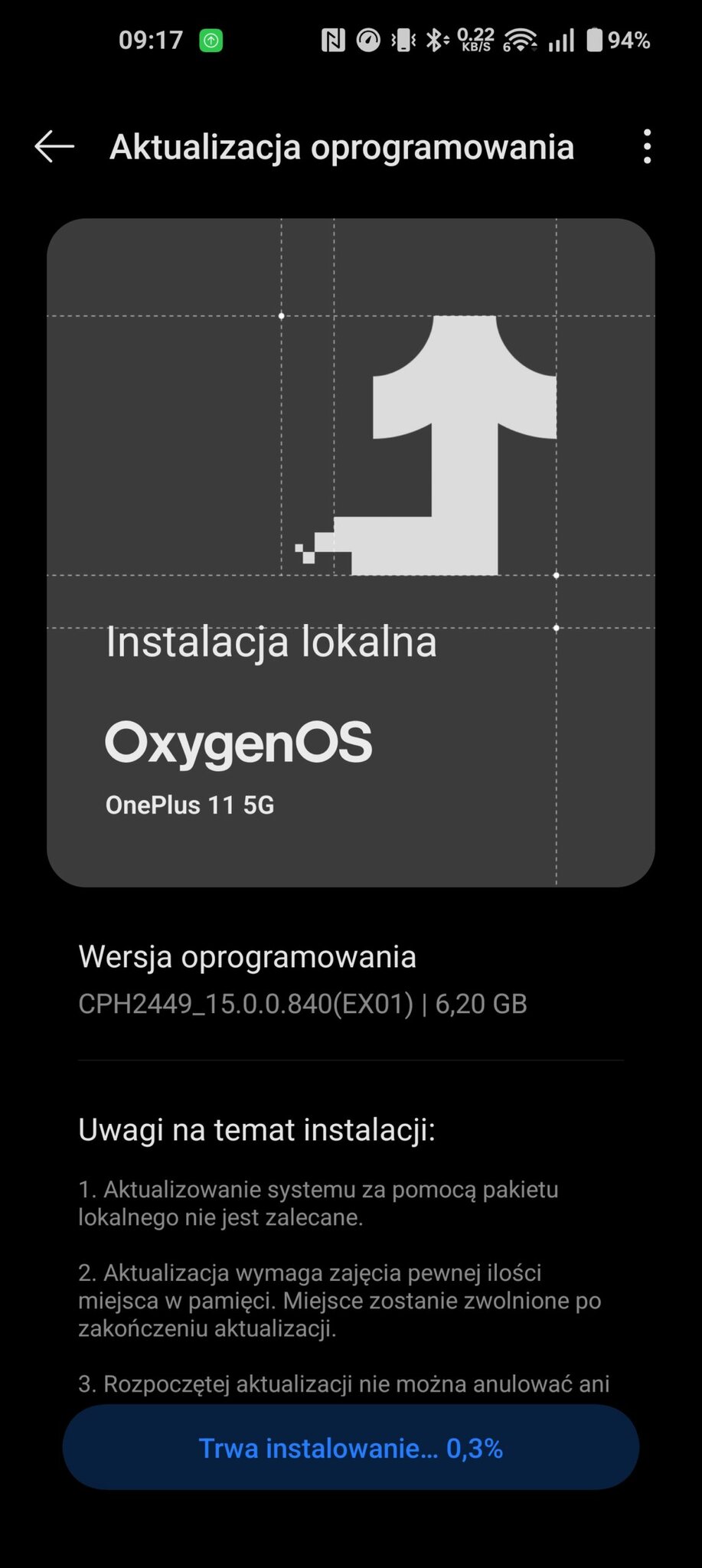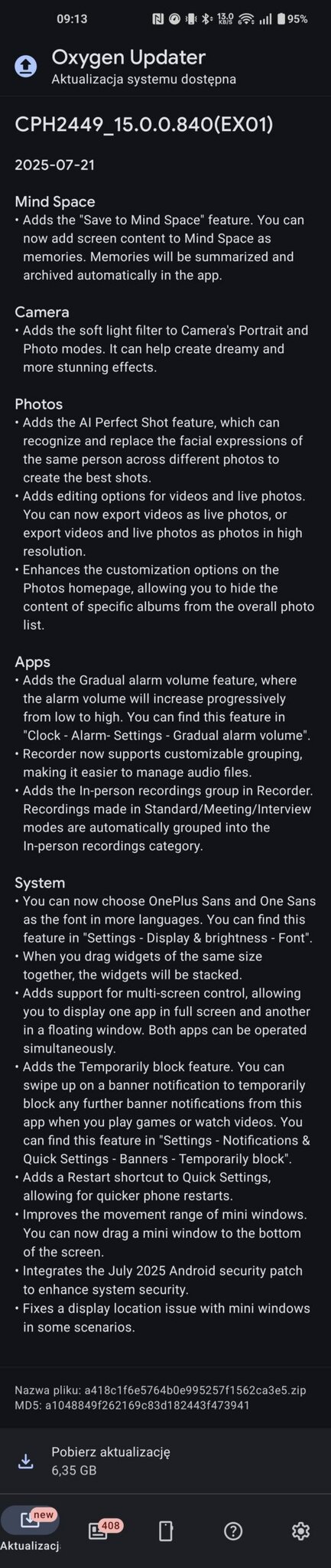 Została ona podpisana ciągiem znaków CPH2449_15.0.0.840(EX01), a jej rozmiar to 1,2 GB. W moim egzemplarzu była ona dostępna z poziomu aplikacji Oxygen Updater, która pobiera paczki prosto z serwerów producenta. Dzięki temu przyspieszyć aktualizacje telefonów OnePlus (a od niedawna także OPPO).