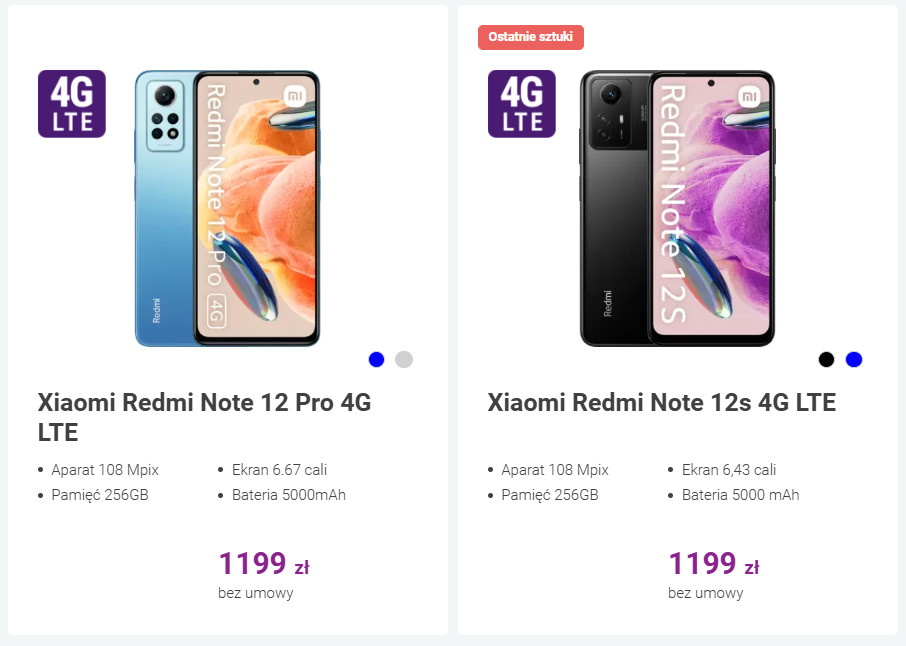 W ofercie sieci Play znajdziemy znacznie więcej ciekawych modeli w cenie około 1200 złotych od innych producentów. Generalnie Play oferuje dobre smartfony, więc tym bardziej nie mogę zrozumieć cen starych Redmi. Szokująca „wyprzedaż” odstaje od cen w innych sklepach, choć zważywszy na wiek smartfonów, ofert nie ma zbyt dużo. Mimo to da się znaleźć Xiaomi Redmi Note 12s już od 699 złotych.