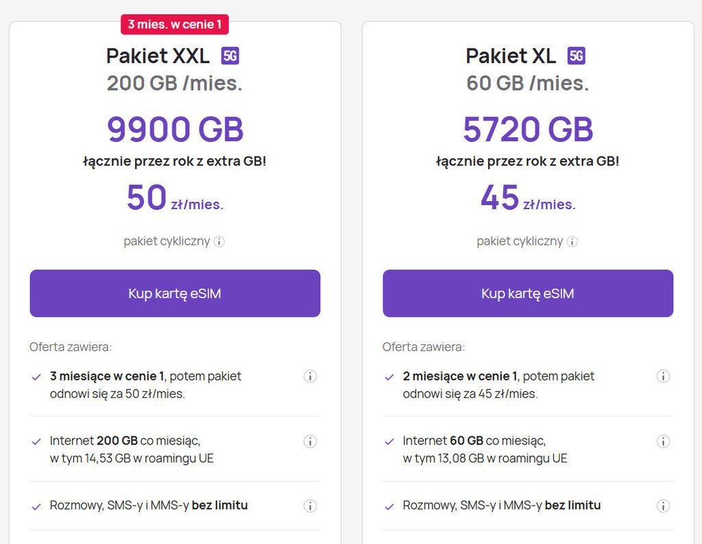 Promocja fioletowego operatora komórkowego obejmuje 2 topowe plany taryfowe prepaid: Pakiet XL 5G oraz Pakiet XXL 5G. Oba zapewniają nielimitowane rozmowy, SMS-y i MMS-y do wszystkich sieci (również w roamingu UE), bardzo dużo internetu 5G w telefonie w kraju, a także spore limity w Unii. Opłata miesięczna wynosi odpowiednio 45 i 50 złotych.
