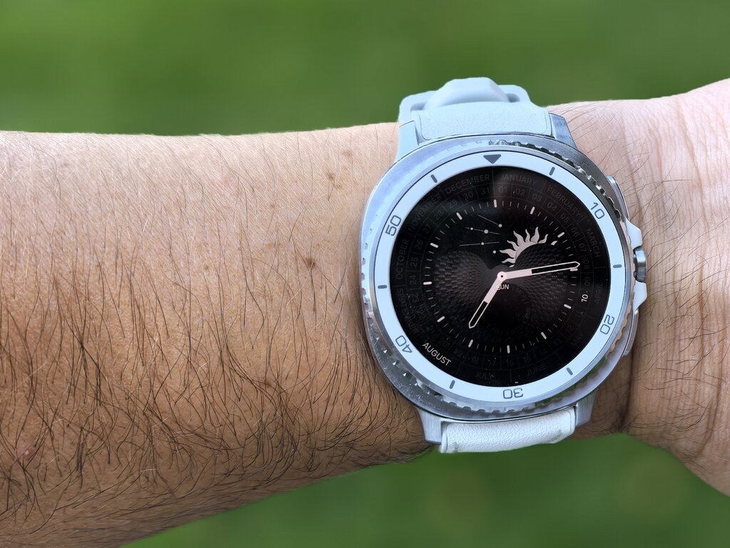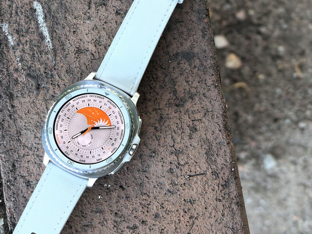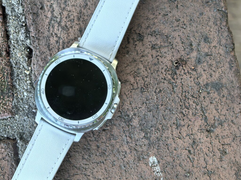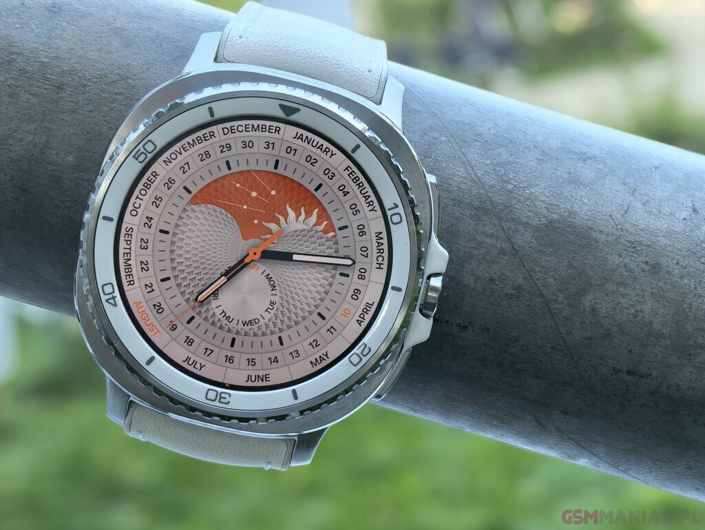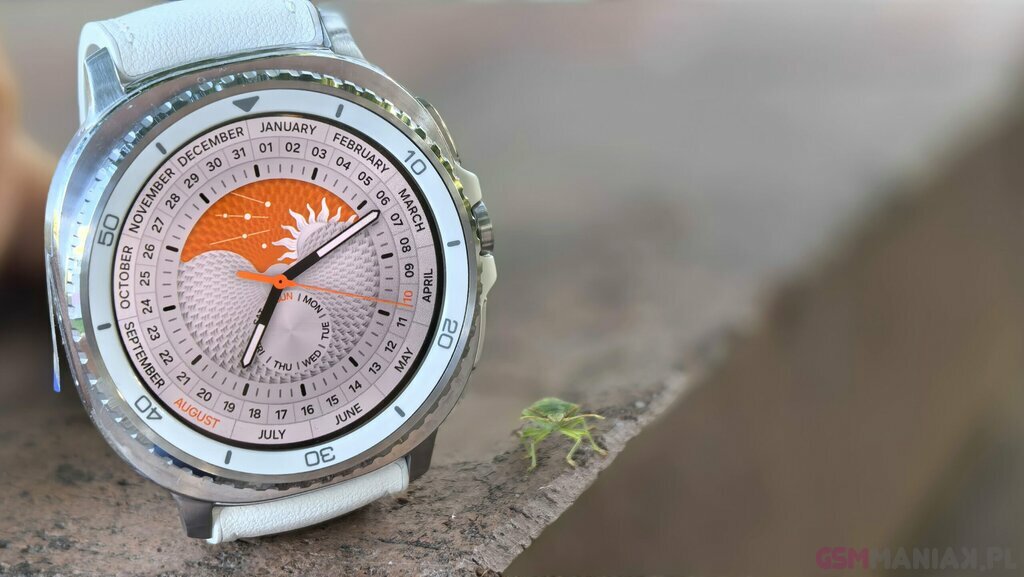 Wizualnie zegarek jest wyraźnie inspirowany Galaxy Watch Ultra. Ma masywniejszą konstrukcję i więcej detali, ale jednocześnie nie idzie aż tak daleko w stronę typowo outdoorowego stylu. Nadal mamy paski z efektem skóry, frezowane detale wokół tarczy i układ przycisków znany z wcześniejszych modeli.