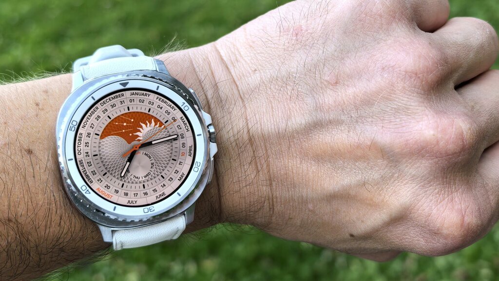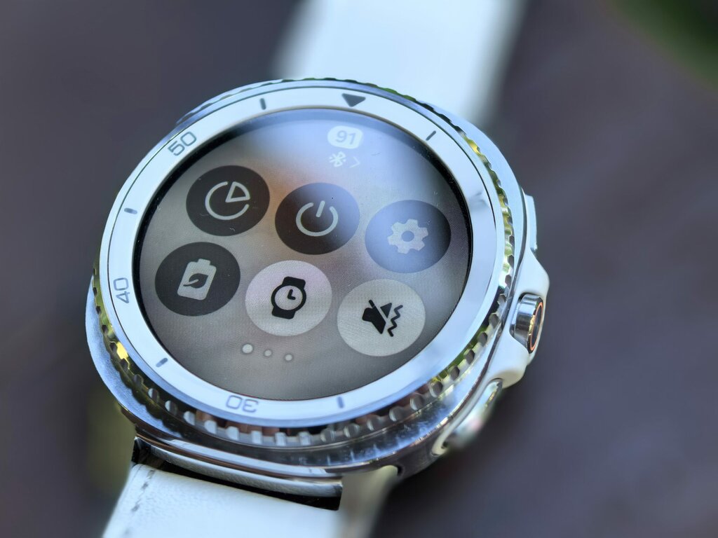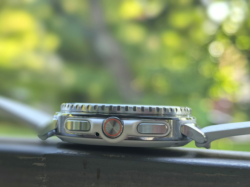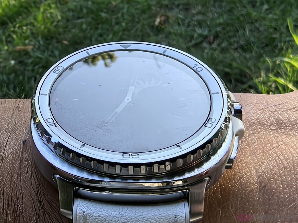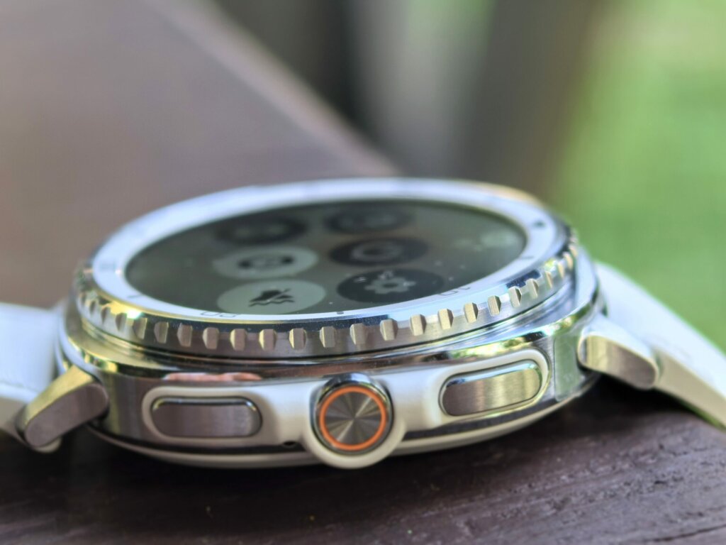 Wizualnie zegarek jest wyraźnie inspirowany Galaxy Watch Ultra. Ma masywniejszą konstrukcję i więcej detali, ale jednocześnie nie idzie aż tak daleko w stronę typowo outdoorowego stylu. Nadal mamy paski z efektem skóry, frezowane detale wokół tarczy i układ przycisków znany z wcześniejszych modeli.