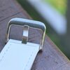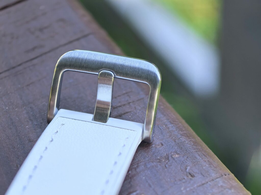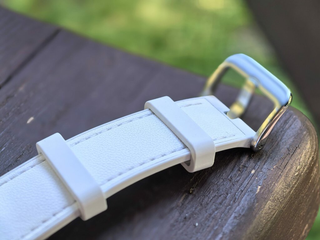 Sam przycisk jest dobrze wyczuwalny pod palcem, ale obudowano go plastikowym pierścieniem, który – nie ukrywam – trochę psuje odbiór. Nie wygląda to źle, ale sprawia wrażenie nieco tymczasowego rozwiązania. Zwłaszcza przy jasnej wersji kolorystycznej zegarka, która niestety nie wygląda tak prestiżowo, jak czarna.