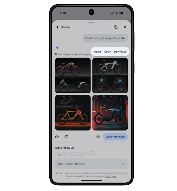 Po wpisaniu Gemini pokazuje, co ma do zaoferowania. Możesz dotknąć obrazu, aby wyświetlić jego podgląd na pełnym ekranie lub dotknąć go i przytrzymać, aby wyświetlić menu z opcjami kopiowania, pobierania lub wstawiania bezpośrednio do dokumentu. Możesz również przesłać plik na swój Dysk za pomocą dedykowanego przycisku podczas podglądu obrazu.