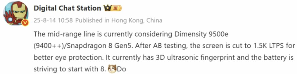 Na początek w specyfikacji pojawiają się dwa możliwe procesory, z którym realme Neo 8 jest obecnie testowany. To MediaTek Dimensity 9500e lub Snapdragon 8 Gen 5. Pierwszy jest oparty na Dimensity 9400+, drugi to w zasadzie Snapdragon 8 Elite pod inną nazwą. Widać wyraźnie, że realme stawia na niemal flagową wydajność.