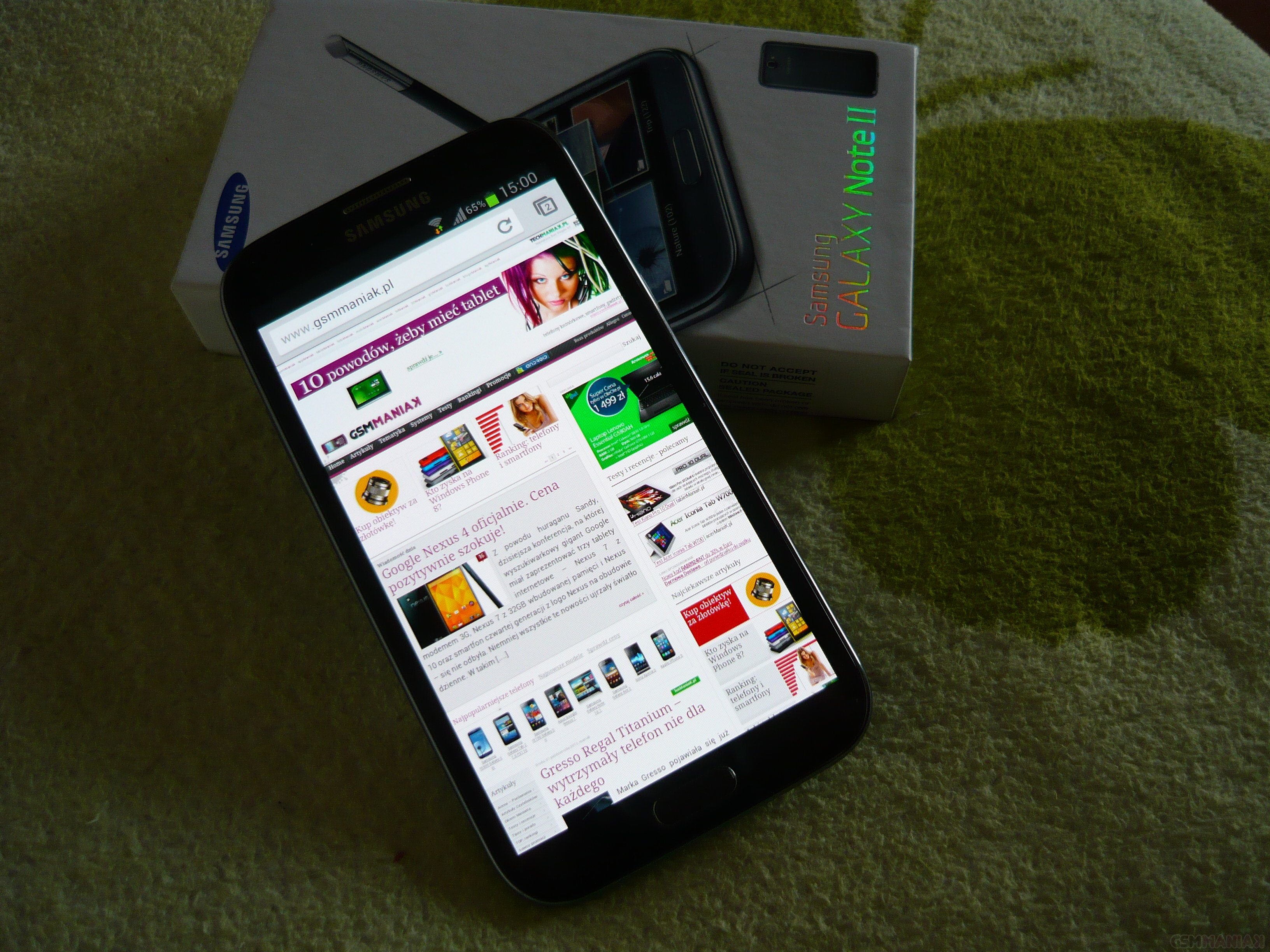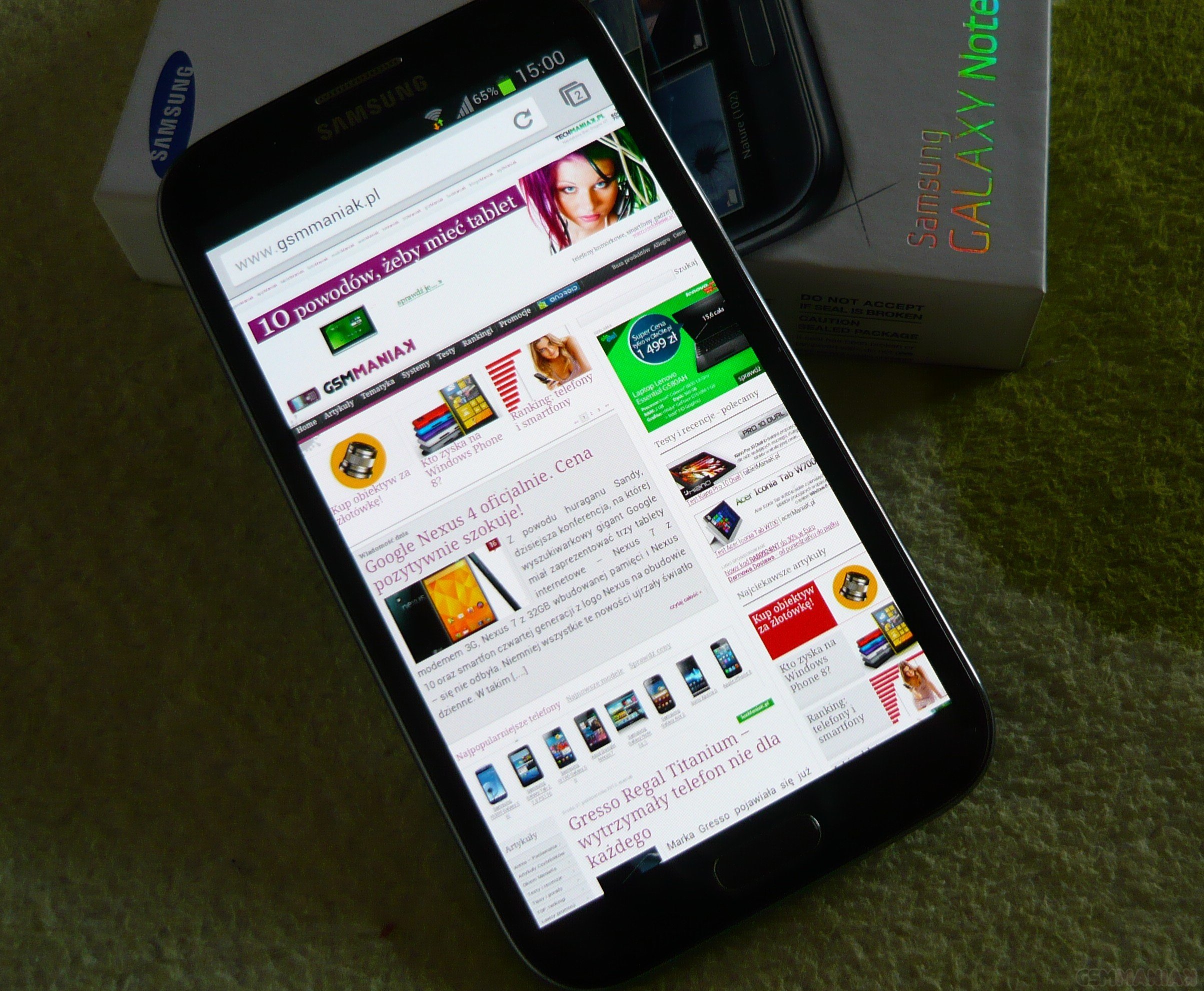 Na pokładzie Samsunga Galaxy Note II znajdziemy dwie preinstalowane przeglądarki internetowe – Google Chrome oraz standardową. Zarówno jedna jak i druga spełnia swoje zadanie. Strony ładują się szybko bez względu czy korzystamy z połączenia WiFi czy szybkiej transmisji danych HSDPA, która oferuje maksymalny transfer z prędkością do 21 Mbps. Powiększanie interesujących nas treści przy wykorzystaniu multidotyku również przebiega bez zarzutu. Jedynym minusem jest brak wsparcia dla Adobe Flash Player, jednak jest to podyktowane wersją systemu Google Android.