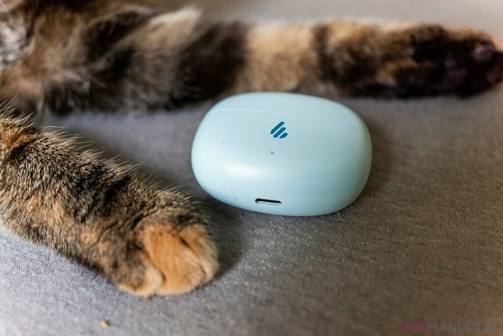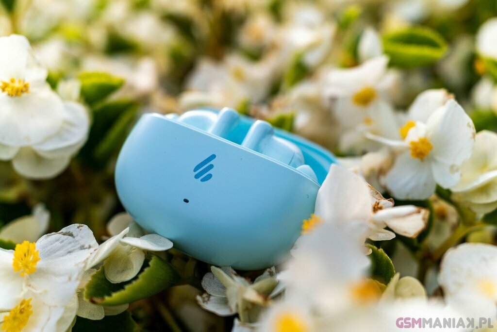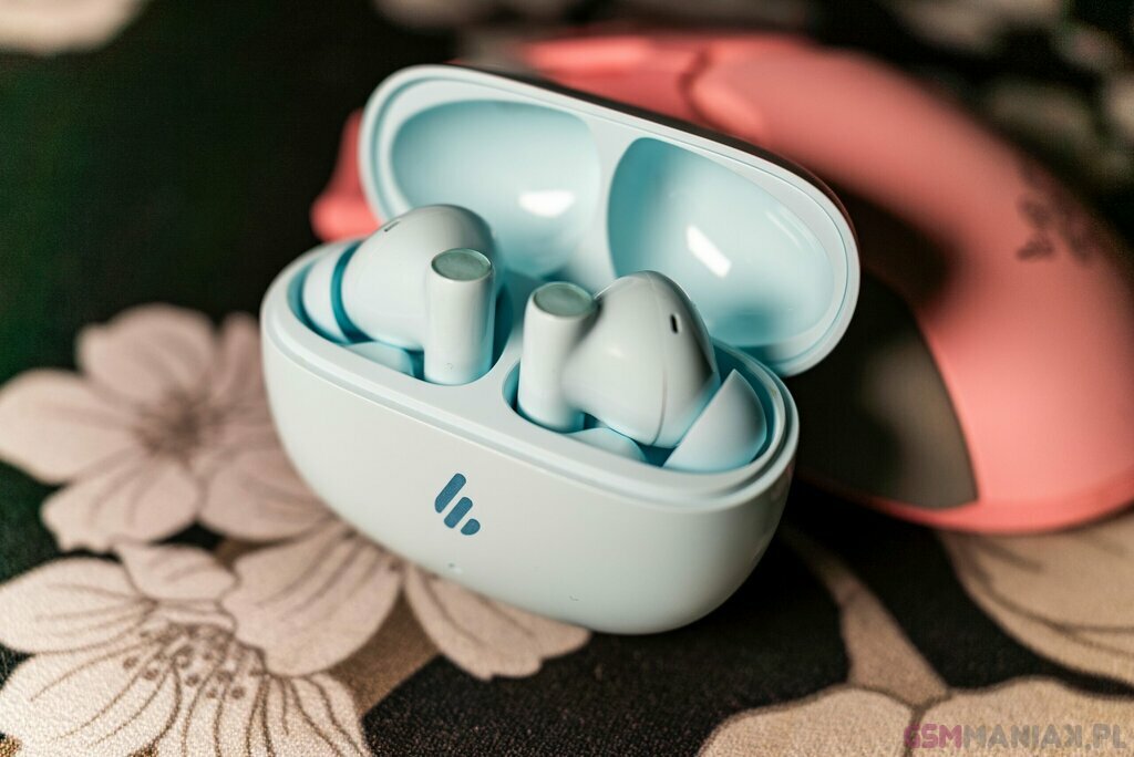 Słuchawki z kolei to już błysk w całości, który jednak mimo to, nie zbiera na sobie odcisków palców. Nie są to ani przesadnie duże, ani małe TWS-y. Spasowanie jest niczego sobie, a patrząc od góry, mamy ciekawy akcent na stemie, w postaci… brokatowego wykończenia? Tak bym to nazwał. W tym obszarze Edifier poradził sobie zwyczajnie dobrze, nie ma się do czego przyczepić.