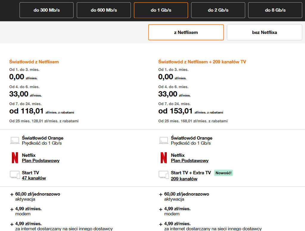W pierwszej kolejności należy zamówić internet domowy w pakiecie z Netflixem z umową na 24 miesiące. Możesz go kupić online, w salonie operatora lub poprzez infolinię. Nawiasem mówiąc, Orange ma bardzo szybki światłowód z prędkościami nawet do 8 Gb/s.