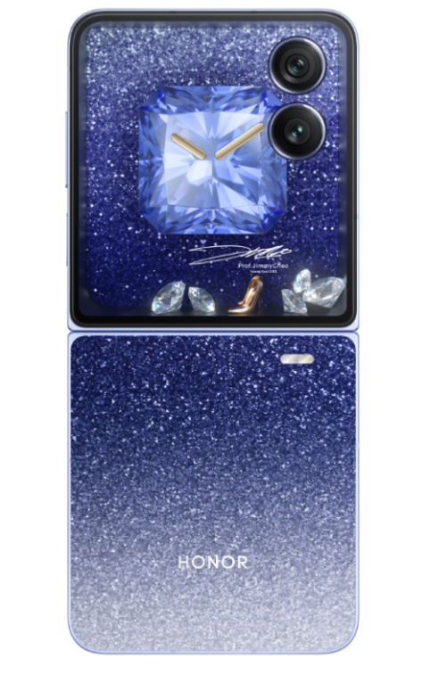 HONOR Magic V Flip 2 wyróżnia się wyjątkową wersją koloru niebieskiego. Została ona zaprojektowana we współpracy z Jimmy Choo (malezyjski projektant) i otrzymała tylny panel ozdobiony kryształkami. Efekt gwiaździstego nieba podkreśla luksusowy charakter urządzenia. To kolejny przykład, jak technologia łączy się dziś ze światem mody (patrz też flagowiec nubia w wersji Starry Sky Collector’s Edition).