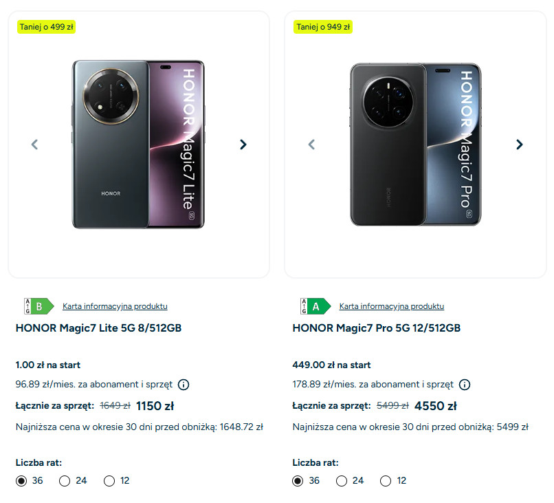 Oba smartfony 5G chińskiego producenta kosztują tyle samo w opcji bez umowy. Do wyboru masz te same raty miesięczne. Różnica to brak dodatkowych opłat w postaci abonamentu komórkowego.