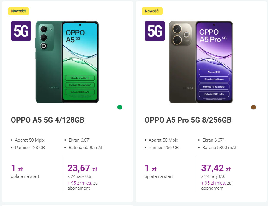 Złotówkę na start kosztuje jeszcze tańszy OPPO A5 5G. Ma on nawet większą baterię 6000 mAh, również funkcje AI w j. polskim i obudowę ze standardem militarnym. Koszt bez umowy to 799 złotych, a w abonamencie Play tylko 569 złotych.
