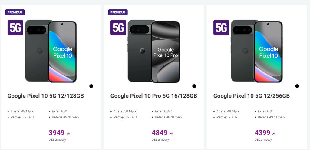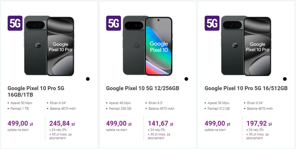 Na play.pl są już dostępne 3 modele z serii Pixel 10, w dodatku w różnych wersjach pamięciowych. Możesz je kupić w abonamencie lub bez umowy, a od Twojego wyboru zależeć będzie ostateczna cena za nowe Pixele, o czym operator wprost nie informuje.
