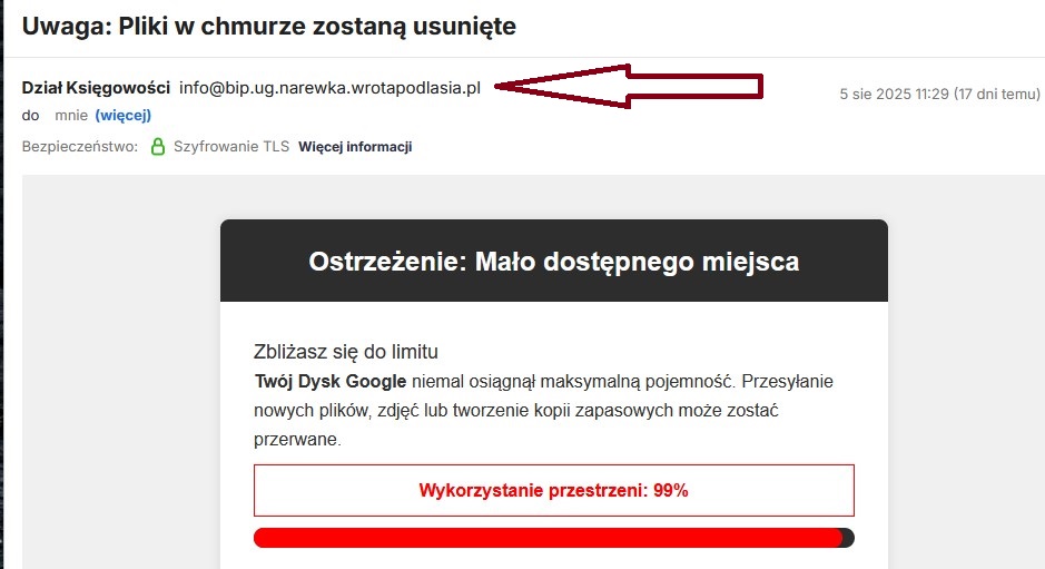 Ale żadna technologia nie zastąpi zdrowego rozsądku. Także jeśli masz jakiegoś alarmującego maila, dotyczącego choćby braku miejsca na Dysku, zawsze zwracaj uwagę na adres, z którego przychodzi takie powiadomienie.