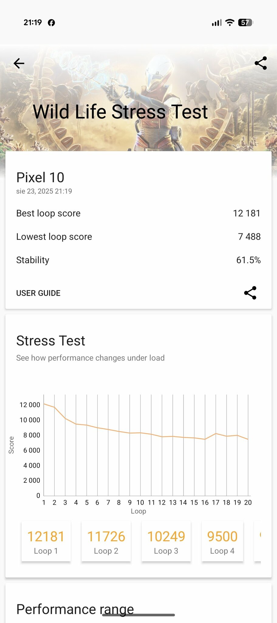 Gdy wyszedł Google Pixel 9a, to bardzo ciekawą kwestią była wydajność w poniższym sprawdzianie. Z jakiegoś powodu, stabilność wyników była wyższa od droższego pobratymca. To samo jest w porównaniu z nowym Pixelem 10, który mimo poprawy w pierwszych „loopach”, końcowo oferuje taką samą wydajność w tym zakresie, co dużo tańszy pobratymiec. Throttling wyniósł w tym wypadku 38,5%, co mimo wszystko jest wynikiem „lepszym” od prekursora.