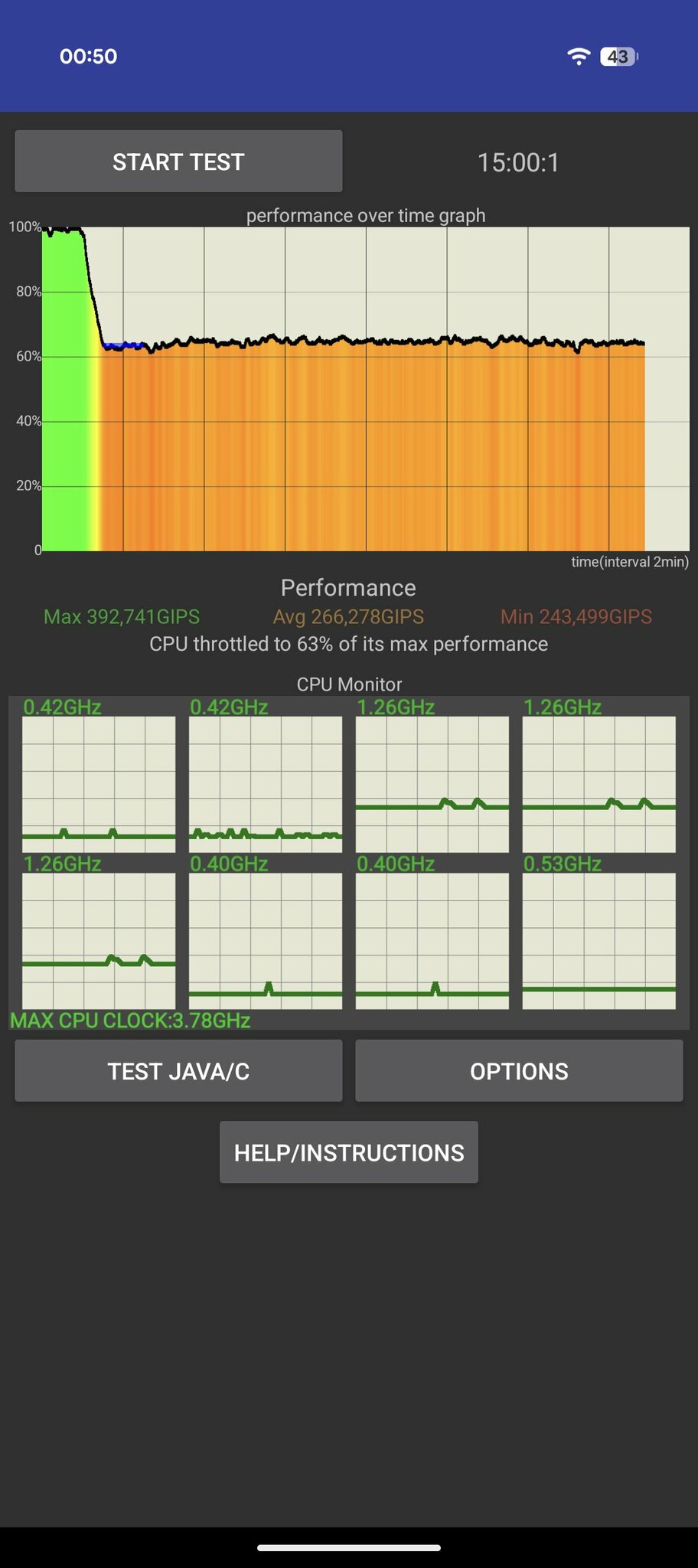 Zaczynamy tradycyjnie od sprawdzianu chłodzenia oraz tego, ile ciepła jest w stanie ono odebrać z procesora. 15-minutowy przebieg idealnie pokazuje, jak w czasie degraduje się wydajność nowego Pixela 10. Co jednak ciekawe, mniej, niżeli było to w przypadku modelu z niższym numerkiem. Po niespełna 2 minutach zatrzymał się na 63% swojej pierwotnej wydajności. Został tak już do końca testu, więc nadal spadek jest mocny i szybki, ale mniejszy od Pixela 9.