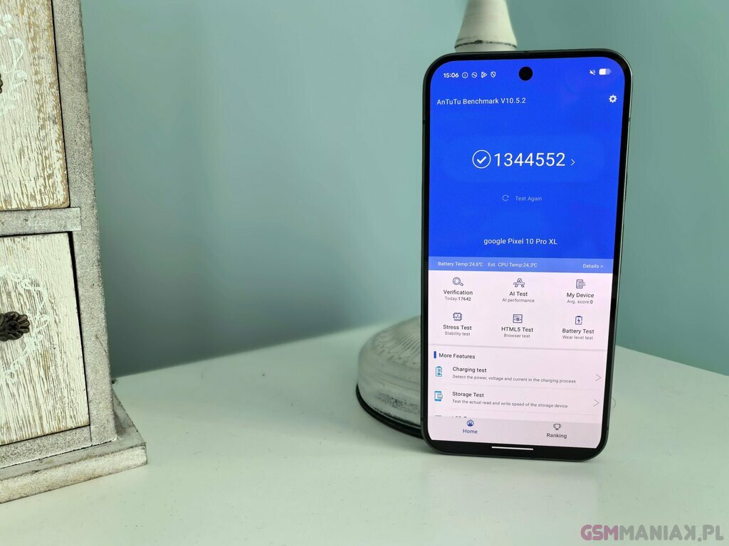 Nie można pominąć kwestii grafiki. Pixel 10 Pro XL wyposażono w GPU PowerVR D-Series DXT-48-1536 i w praktyce sprawdza się on naprawdę dobrze. Każdy popularny tytuł ze sklepu Google Play działa płynnie, a jedyne spadki wydajności pojawiają się w wyjątkowo wymagających momentach. Co ważne, nie przekłada się to na przyjemność grania, bo urządzenie nawet pod pełnym obciążeniem pozostaje stabilne.