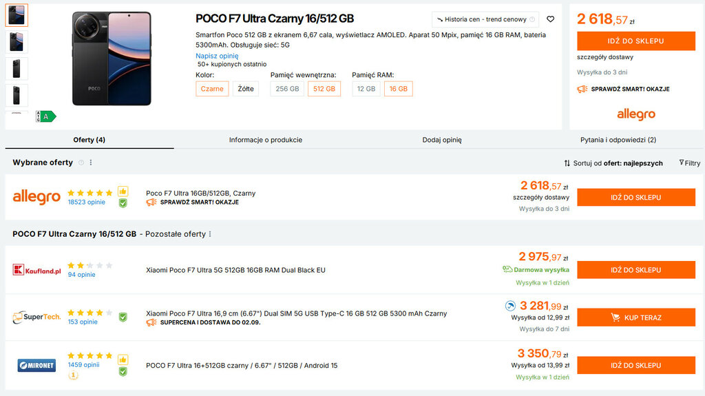 Skąd taka mała dostępność POCO F7 Ultra w naszym kraju? Wygląda to trochę tak, jakby największe sklepy i sieci GSM bały się go mieć w swojej ofercie, bo mogłaby załamać się sprzedaż drogich smartfonów klasy premium. Na koniec dodam, że powyższe ceny ~2700 zł wcale nie są najniższe, gdyż możesz kupić POCO F7 Ultra w jeszcze niższej cenie.