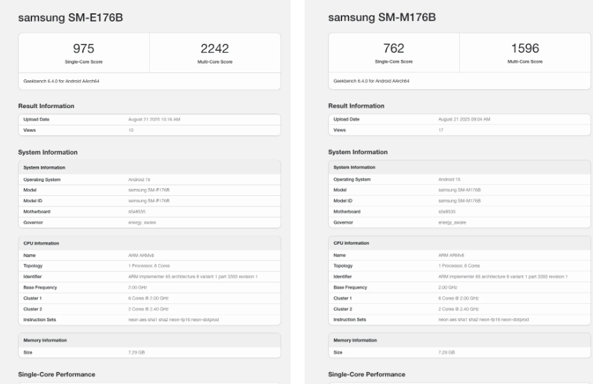 Ciekawie prezentują się wyniki. Samsung Galaxy F17 5G uzyskał 975 pkt w teście jednego rdzenia i 2242 pkt w wielordzeniowym. Z kolei Samsung Galaxy M17 5G wypadł słabiej. Wykręcił odpowiednio 762 pkt i 1596 pkt. Różnice te mogą jednak wynikać z odmiennych warunków testowych. W sprzedaży urządzenia powinny oferować zbliżoną wydajność.