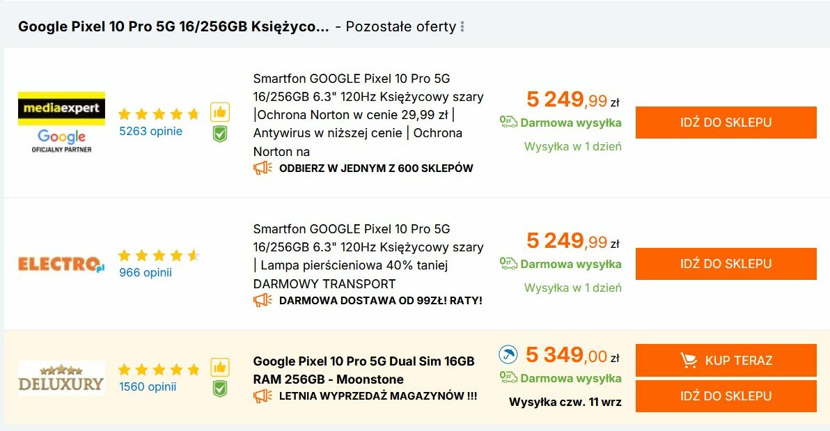 Pomimo tego, że od premiery nie minął nawet jeszcze miesiąc, to już można go kupić w niższej cenie. Niektórzy sprzedawcy oferują nowego Pixela już od około 4250 złotych, podczas gdy oficjalni partnerzy Google, trzymają się premierowej ceny 4849 złotych za wariant 128 GB.