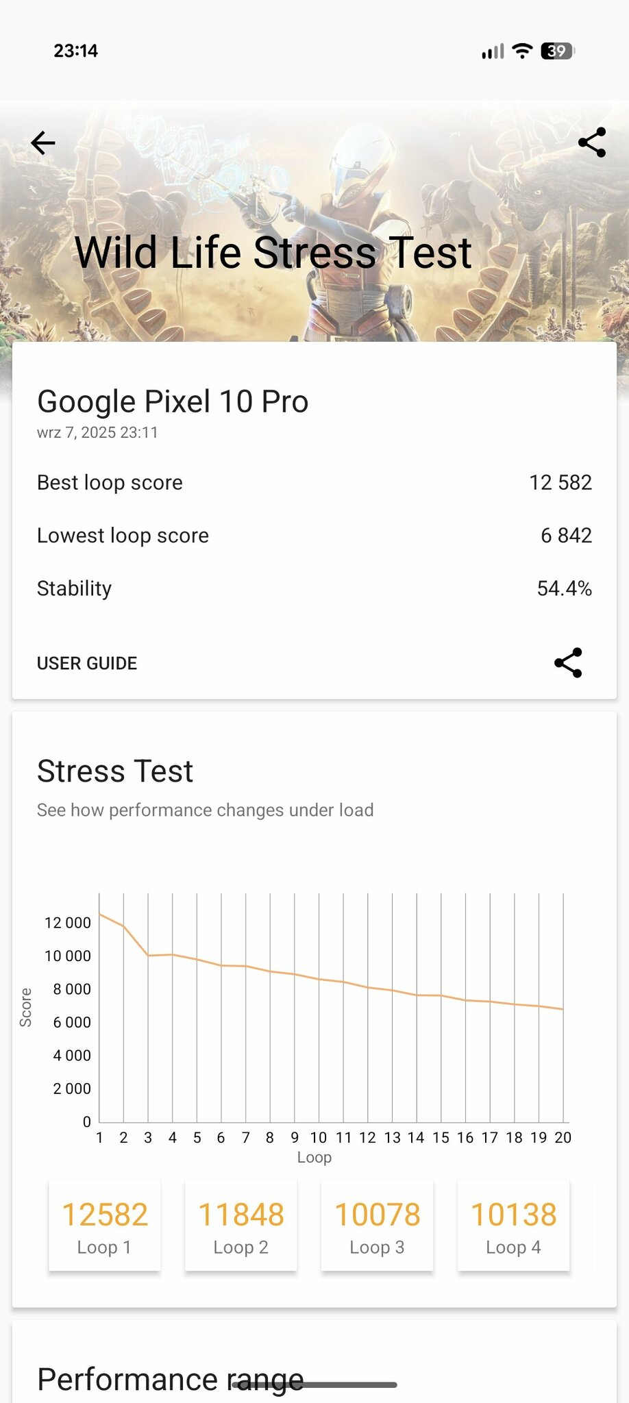 Nie zapomniałem o sprawdzeniu również tego, jak nowy Pixel radzi sobie w scenariuszach gamingowych. Tutaj do akcji wkracza 3DMark Wild Life Stress Test, który pokazuje także, jak stabilna jest wydajność w takich zastosowaniach. Jak widać, jest szybciej względem prekursora, jednak stabilność jest na niższym poziomie. Oznacza to większy throttling układu graficznego.