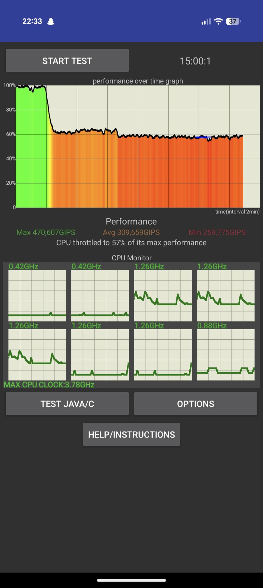Zacznijmy tradycyjnie od sprawdzenia, jak całość radzi sobie w sprawdzianie, który mocno obciąża procesor. Ma on za zadanie sprawdzić, czy chłodzenie jest wystarczająco wydajne. Tutaj widzimy, że już po 2 minutach jego wydajność mocno spada, a po całości testu dostajemy informację, że względem początku „wytracono” 43% pierwotnej wydajności. To nieznacznie lepszy wynik od poprzednika, lecz jeżeli spojrzeć na stabilność, to jest dużo lepiej.
