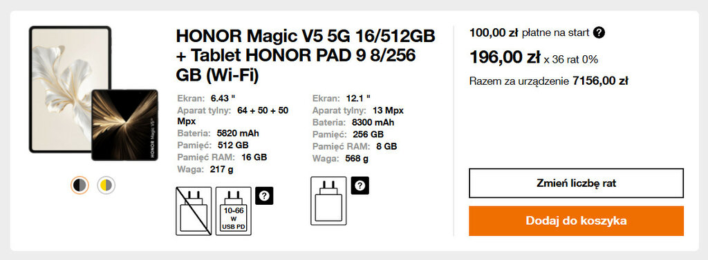 Prezentem dołączanym do Honora Magic V5 jest tablet Honor Pad 9 8/256 GB (Wi-Fi). Na orange.pl możesz wybrać samego smartfona Magic V5 z pamięcią 16/512 GB w cenie 99 zł na start lub w zestawie z powyższym tabletem. Opłata początkowa wzrasta wówczas do poziomu 100 złotych. Raty za sprzęt pozostają niezmienne.