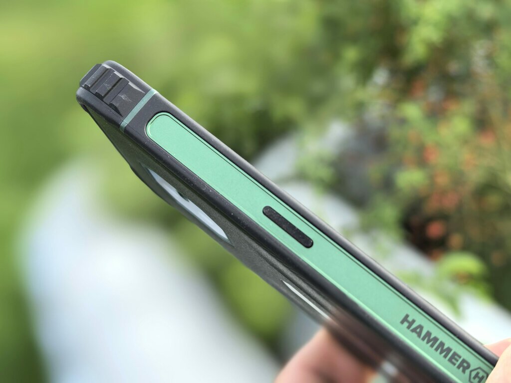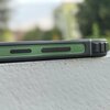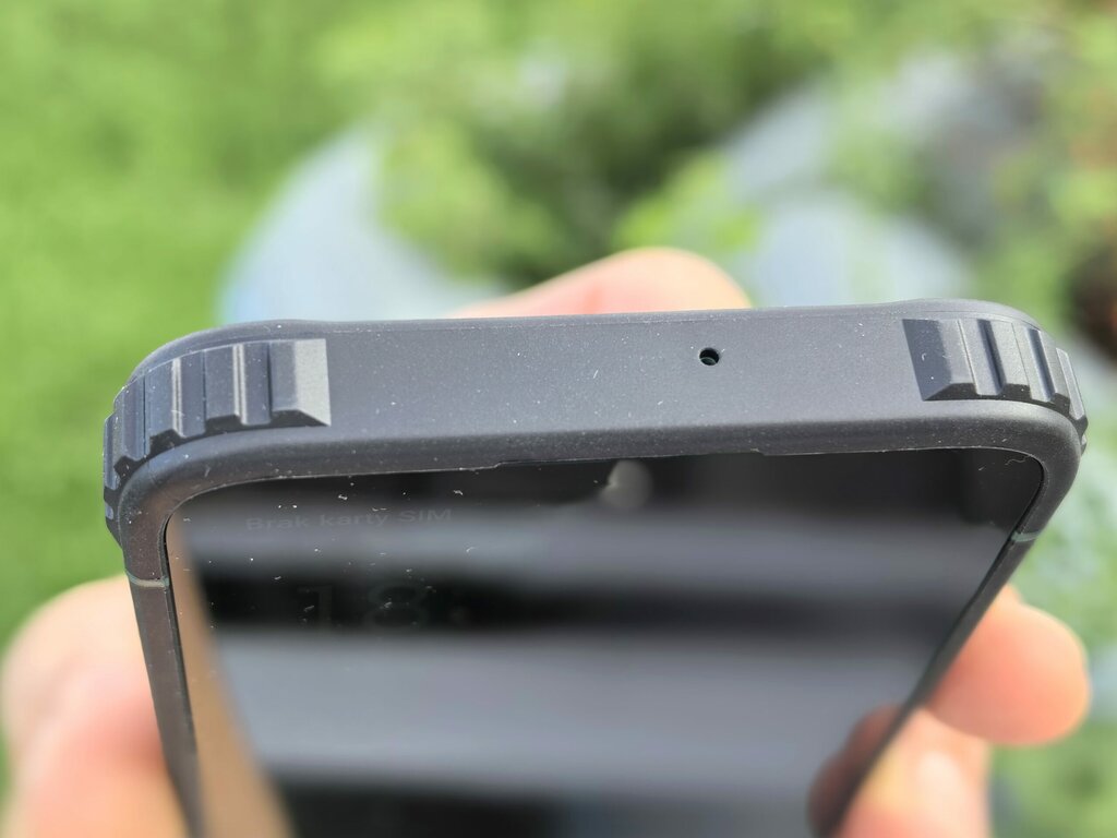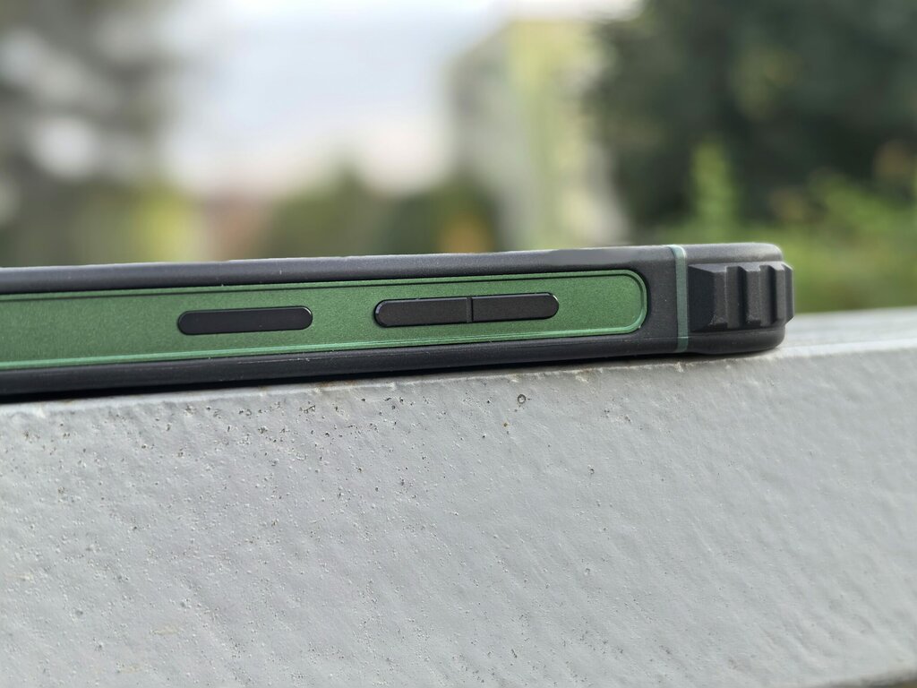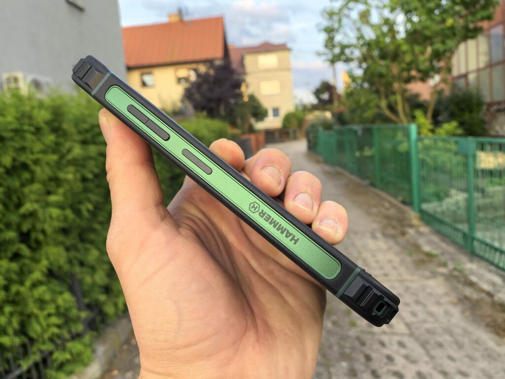 Mamy tu sporo tworzywa sztucznego, jeszcze więcej gumy i wzmocnione narożniki, które skutecznie amortyzują upadki. Do tego producent dodał metalową ramkę, częściowo odsłoniętą i pomalowaną na zielono. To niby drobny akcent, a jednak sprawia, że urządzenie wygląda ciekawiej i nie jest pozbawione stylu.
