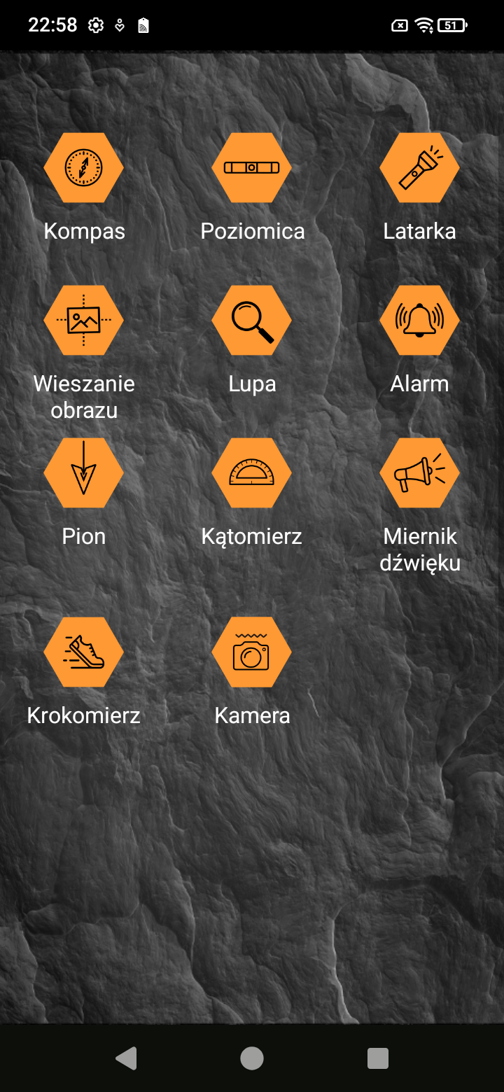 Na dokładkę dostajemy coś, czego nie mają typowe telefony – aplikację „Narzędzia”. To zestaw funkcji przydatnych zarówno w pracy, jak i podczas wypraw w teren. Znajdziemy tu kompas, poziomicę, miernik hałasu, latarkę czy lupę.