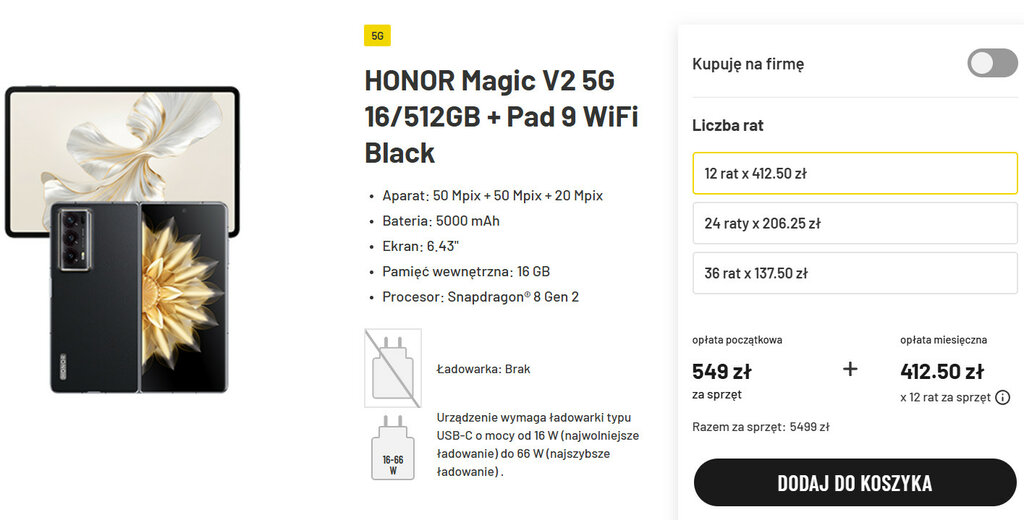 Plush udostępnia swoje smartfony na raty. Honor Magic V2 może być przez Ciebie zamówiony na 12, 24 lub 36 rat, a w zestawie sprzedażowym znajduje się jeszcze Honor Pad 9 WiFi. Ile zapłacisz za sprzęt chińskiego producenta?