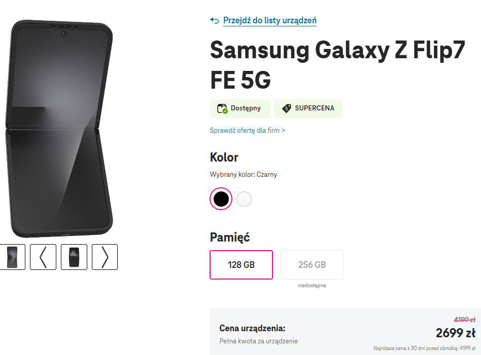 Zaledwie tydzień temu pisałem o sprzedaży promocyjnego zestawu Galaxy Z Flip7 FE w T-Mobile, ale z tego co widzę, nie jest już dostępny na stronie operatora. W zamian kupisz samego smartfona bez abonamentu, za to na raty 0%.