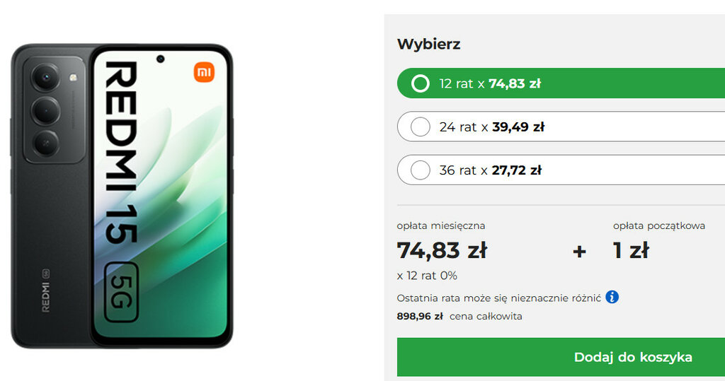Widać wyraźnie, że wraz ze wzrostem liczby rat są one co prawda niższe w skali miesiąca, ale przekładają się na wyższą łączną kwotę Xiaomi Redmi 15 5G. Takie same ceny panują na plushbezlimitu.pl, a obie oferty różnią się abonamentami (Plush ma tańsze plany taryfowe).
