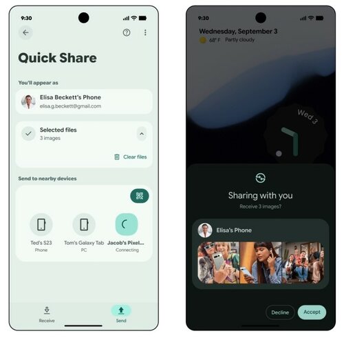 Google przeprojektowuje funkcję Quick Share na Androidzie, aby była znacznie prostsza w obsłudze i intuicyjna. Dzięki temu, każdy użytkownik może błyskawicznie przełączać się między wysyłaniem a odbieraniem, wyświetlać podgląd udostępnianych zdjęć i od razu otwierać odebrane pliki.