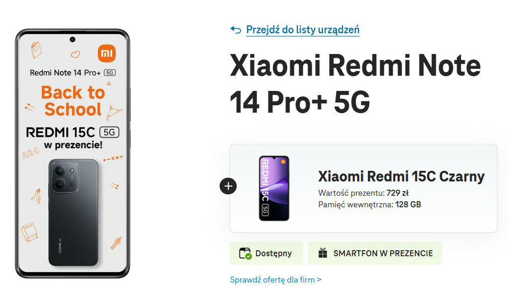 W ofercie promocyjnej T-Mobile Xiaomi Redmi Note 14 Pro+ oferowany jest z dyskiem 512 GB. Jest to topowa wersja tego smartfona, do którego dostaniesz w prezencie Xiaomi Redmi 15C 128 GB. Za wszystko zapłacisz bez umowy 1999 złotych, a wartość upominku to – według operatora – 729 złotych. Sprawdziłem, czy jest tak w rzeczywistości.
