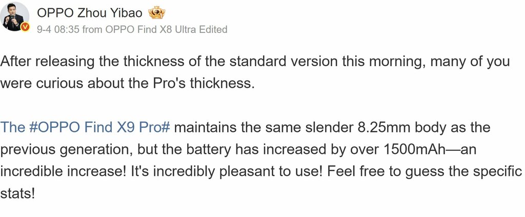 Zhou Yibao jest odpowiedzialny za flagową linię Find i sam potwierdził ważne informacje na temat nadchodzącego flagowca. Oppo Find X9 Pro otrzyma kolosalną jak na flagową półkę baterię o pojemności około 7500 mAh. To o 50% więcej od Samsunga Galaxy S25 Ultra.