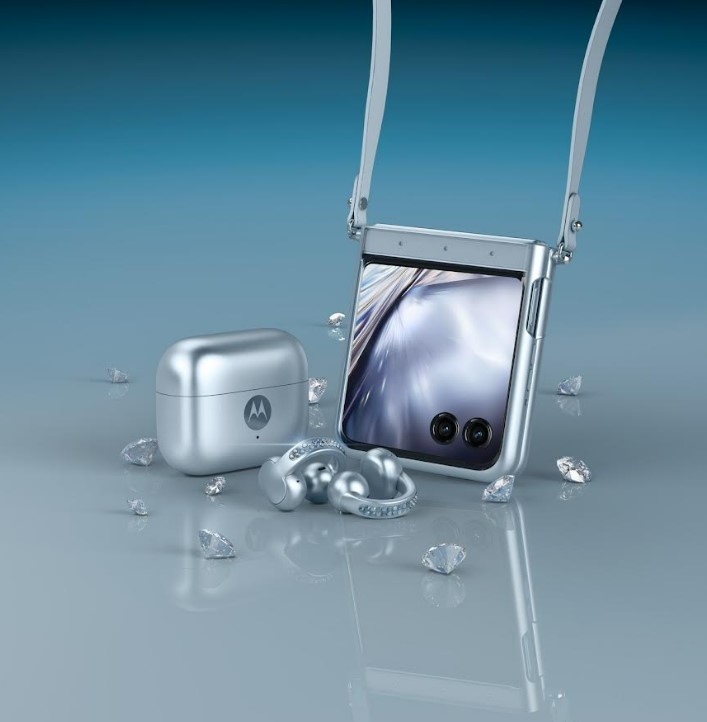 Smartfon wyróżnia się nowym kolorem Pantone Ice Melt i pikowaną fakturą ozdobioną 35 ręcznie osadzonymi kryształami Swarovski. Kryształowe detale trafiły nawet na przyciski głośności. Słuchawki moto buds loop dostępne są w tej samej kolorystyce. Zestaw uzupełnia eleganckie etui z paskiem.