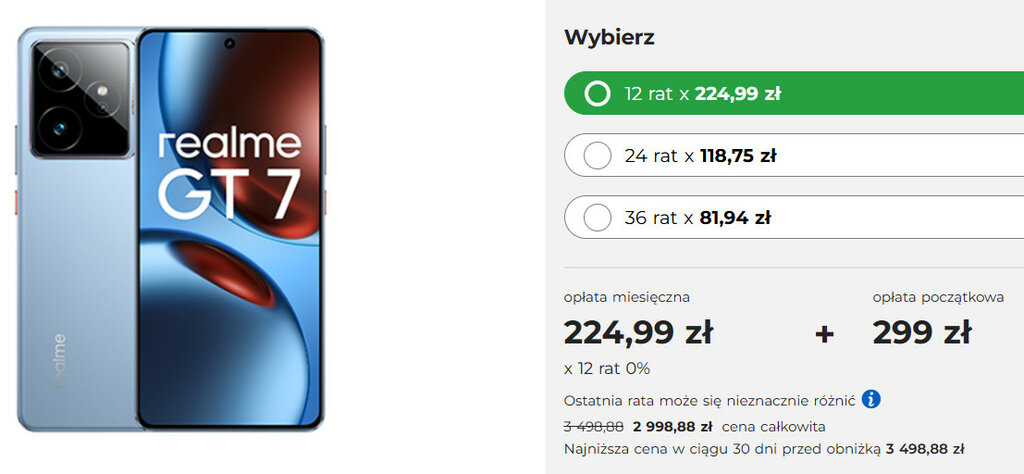 W tej samej sieci komórkowej Plus możesz też skusić się na realme GT7. Smartfon wyraźnie tanieje z poziomu 3499 do 2999 złotych. W zamian otrzymasz MediaTeka Dimensity 9400e z zegarem do 3,40 GHz i 12/512 GB wewnętrznej pamięci. Możesz też liczyć na jeszcze lepszy certyfikat pyło/wodoszczelności niż Galaxy S25 FE (IP69 zamiast IP68). Jakby tego było mało, jest tu ogromna bateria 7000 mAh z szybkim ładowaniem aż 120 W. Ekran LTPO AMOLED 6,78″ ma większe zagęszczenie pikseli na cal (~450 ppi).