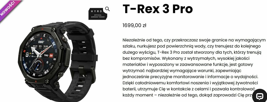 Na początek sama cena w Polsce. Bazując na kwocie w euro, mogliśmy oczekiwać znacznie gorszej wyceny, ale producent zdecydował się na przelicznik wynikający z kursu. Dzięki temu Amazfit T-Rex 3 Pro kosztuje u nas 1699 złotych i moim zdaniem to rozsądna kasa.