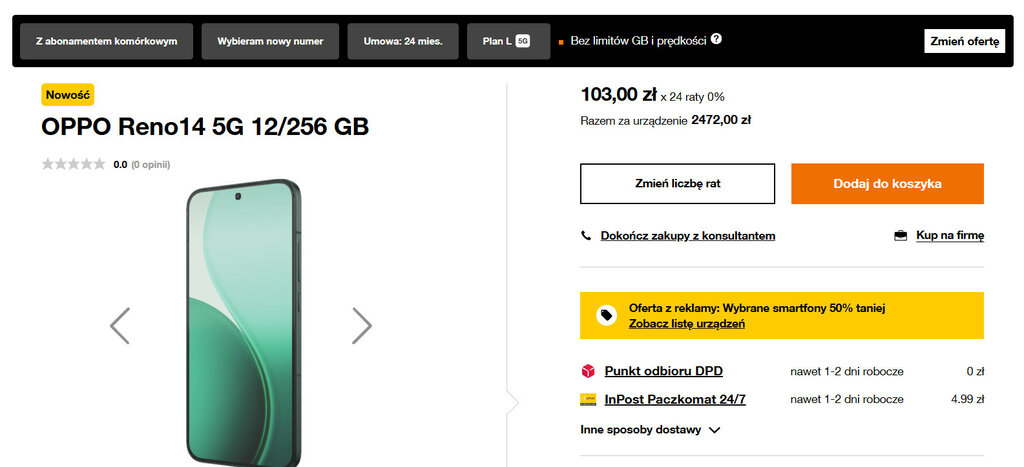 Od premiery OPPO Reno 14 w Orange minęły niecałe 2 tygodnie, a smartfon ten wciąż jest dostępny (jeśli chodzi o operatorów) wyłącznie w tej sieci GSM. Jego ostateczny koszt zależy od wybranego planu taryfowego.