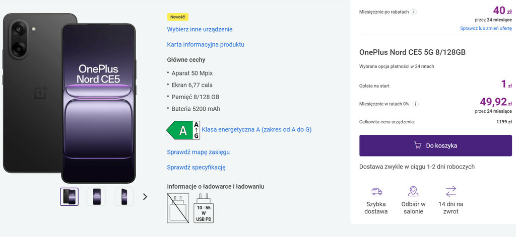Oczywiście mowa wówczas abonamencie. OnePlus Nord CE5 kosztuje na start 1 zł już w niedrogim Abonamencie S 5G (40 zł na miesiąc). Opłata ratalna za sprzęt to z kolei 49,92 zł, co w skali 24 miesięcy daje kwotę 1199 złotych.