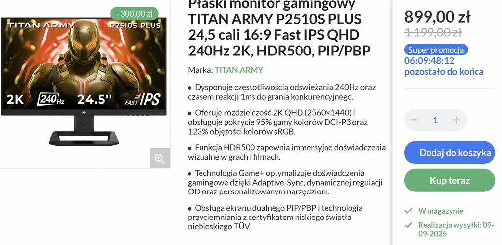 Monitor dla graczy z małym biurkiem to czasami spore wyzwanie zakupowe, a to ze względu na niewielką ilość modeli z przekątną 24.5 cala. Jednym z chlubnych wyjątków jest Titan Armu P2510S Plus, w promocji kosztujący 899 złotych (obniżka to 300 złotych). To IPS LCD o rozdzielczości 2K i z odświeżaniem 240 Hz. Do tego możesz liczyć na 90% pokrycie skali kolorów DCI-P3.