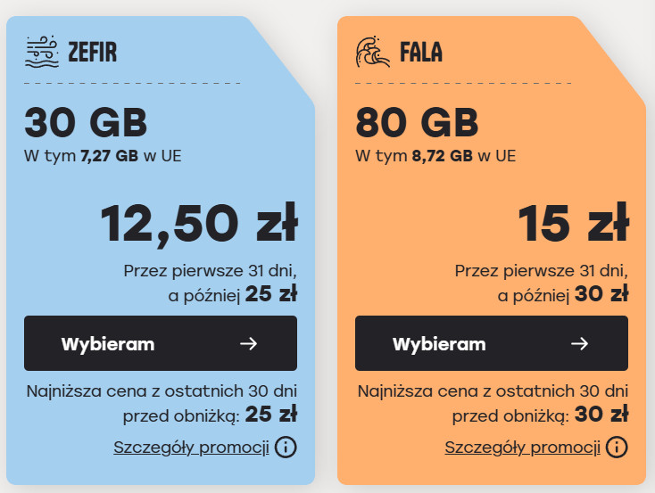 Do wyboru masz zasięg Plusa lub Orange, poza tym możesz liczyć na Cashback -20% za terminową płatność, tym samym obniżając cenę pakietu do zaledwie 12 złotych miesięcznie. Zyskasz też ekologiczną kartę eSIM oraz – naturalnie – nielimitowane rozmowy, SMS-y i MMS-y do wszystkich. Fonia oferuje jeszcze pakiet za 20 zł, ale od drugiego miesiąca jest to już 40 zł miesięcznie.