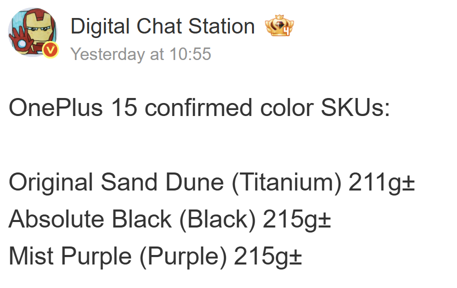 Digital Chat Station podzielił się kolejnymi doniesieniami na temat OnePlusa 15. Flagowiec będzie oferowany w trzech wersjach kolorystycznych, które nieco różnią się od siebie kolorem. Mamy więc pustynny, czyli typowo złoty, bardzo czarny (ten jest najciekawszy, materiał ma pochłaniać światło) oraz fioletowy. Miło, że jest tu choć trochę szaleństwa.