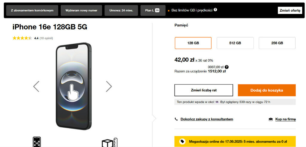 O rabacie -50% iPhone’a 16e w Orange pisałem już w ostatnim dniu sierpnia, a teraz oprócz znacznie tańszego smartfona zyskasz też tańszy abonament. Apple iPhone 16e 128 GB spłacany jest w 36 ratach 0% w kwocie zaledwie 42 zł na miesiąc. W sumie telefon kosztuje na orange.pl 1512 złotych zamiast 3087. Na samym urządzeniu zaoszczędzisz dokładnie 1575 złotych.