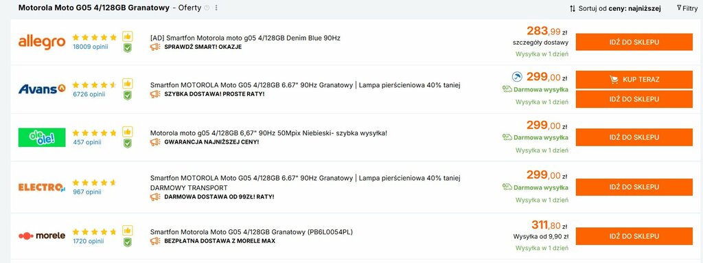 A jak ona wypada na tle pozostałych wystawców z Polski? Być może oszczędność nie jest gigantyczna, ale wciąż mówimy o najtańszej propozycji. U innych za ten sam model zapłacisz przynajmniej 299 złote, a poniżej możesz to sprawdzić.